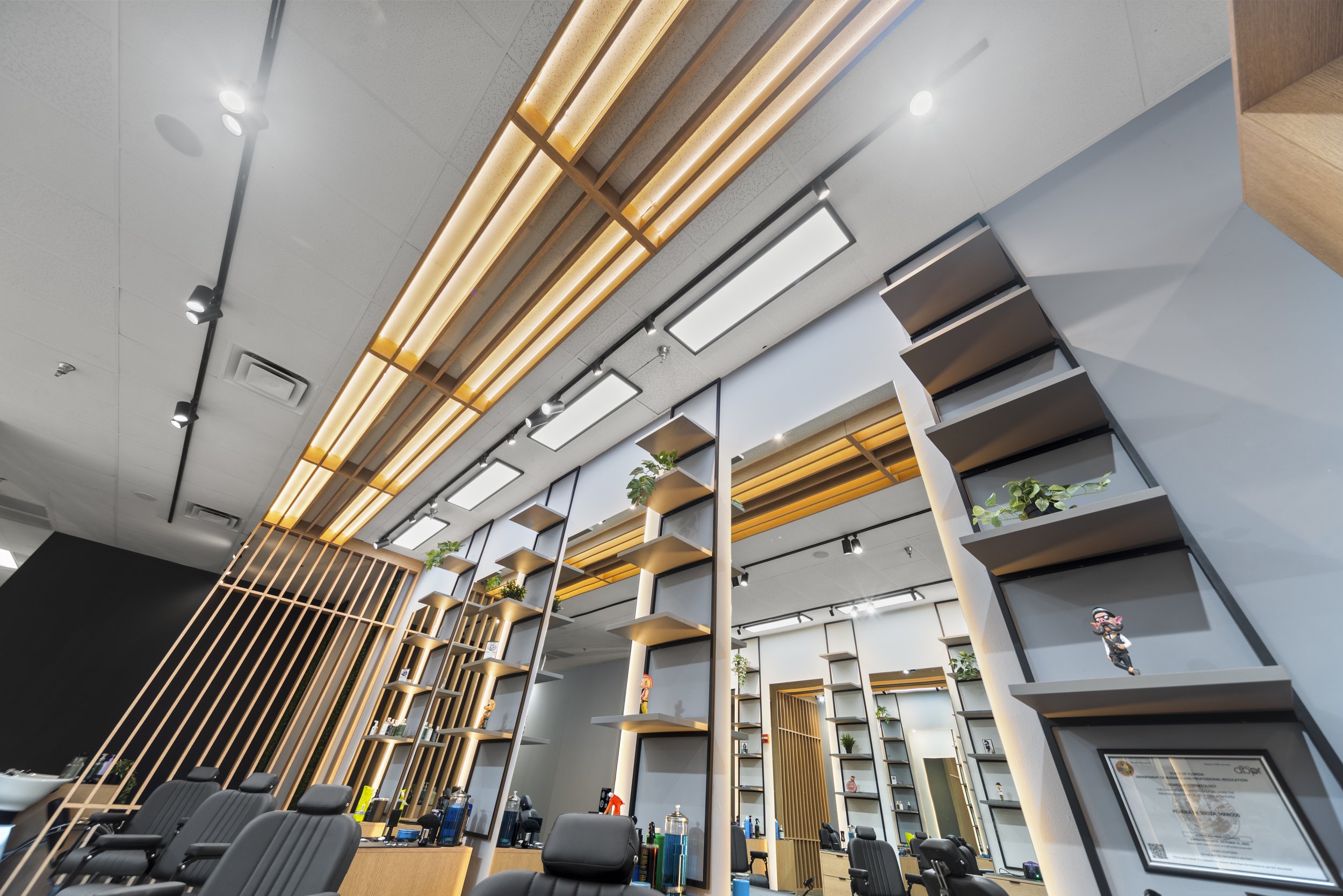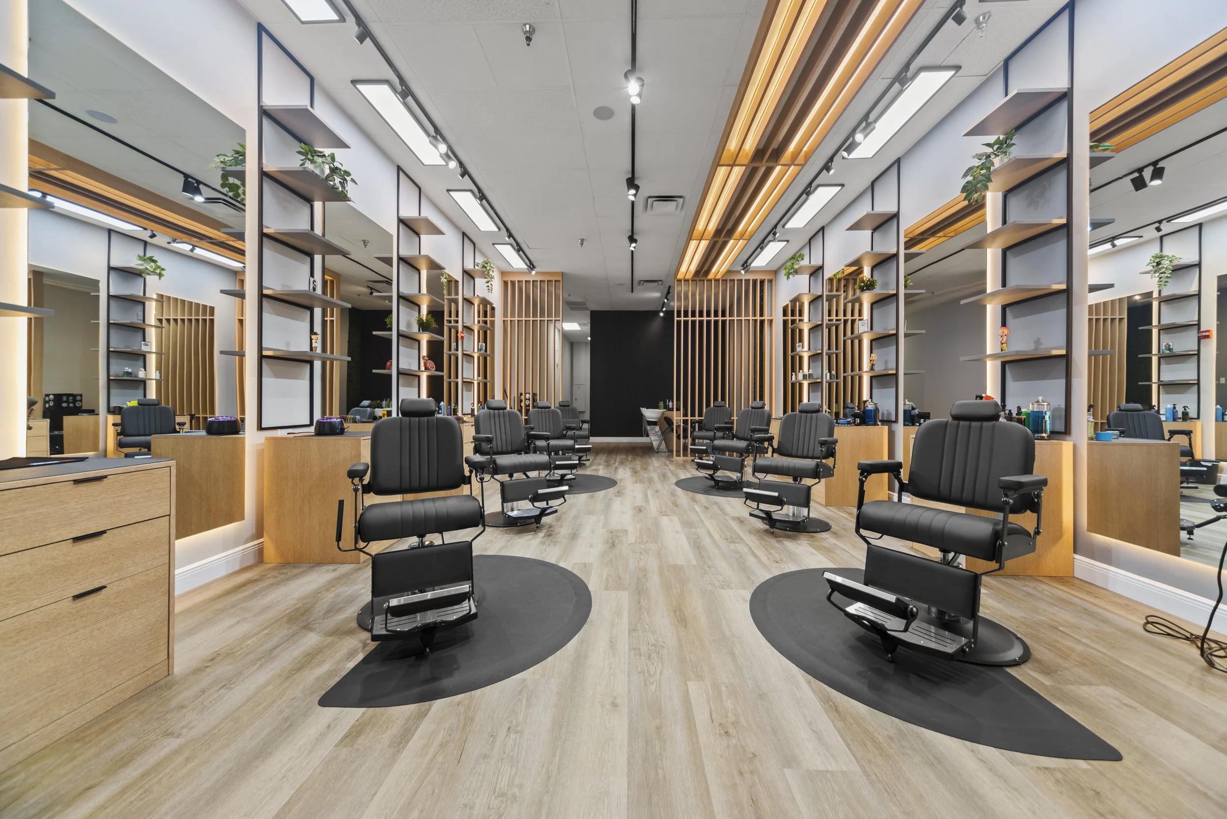 Modern barbershop interior with multiple styling chairs, wooden shelving, and mirrors.