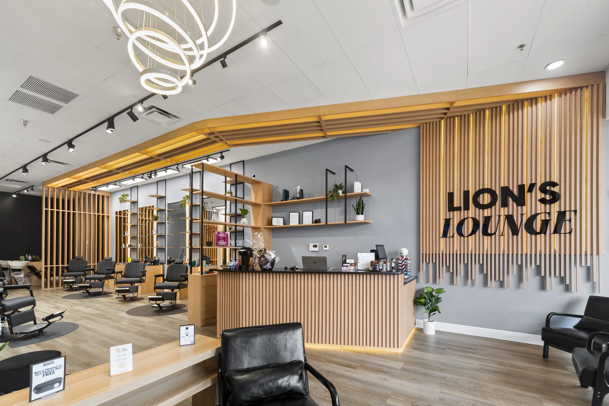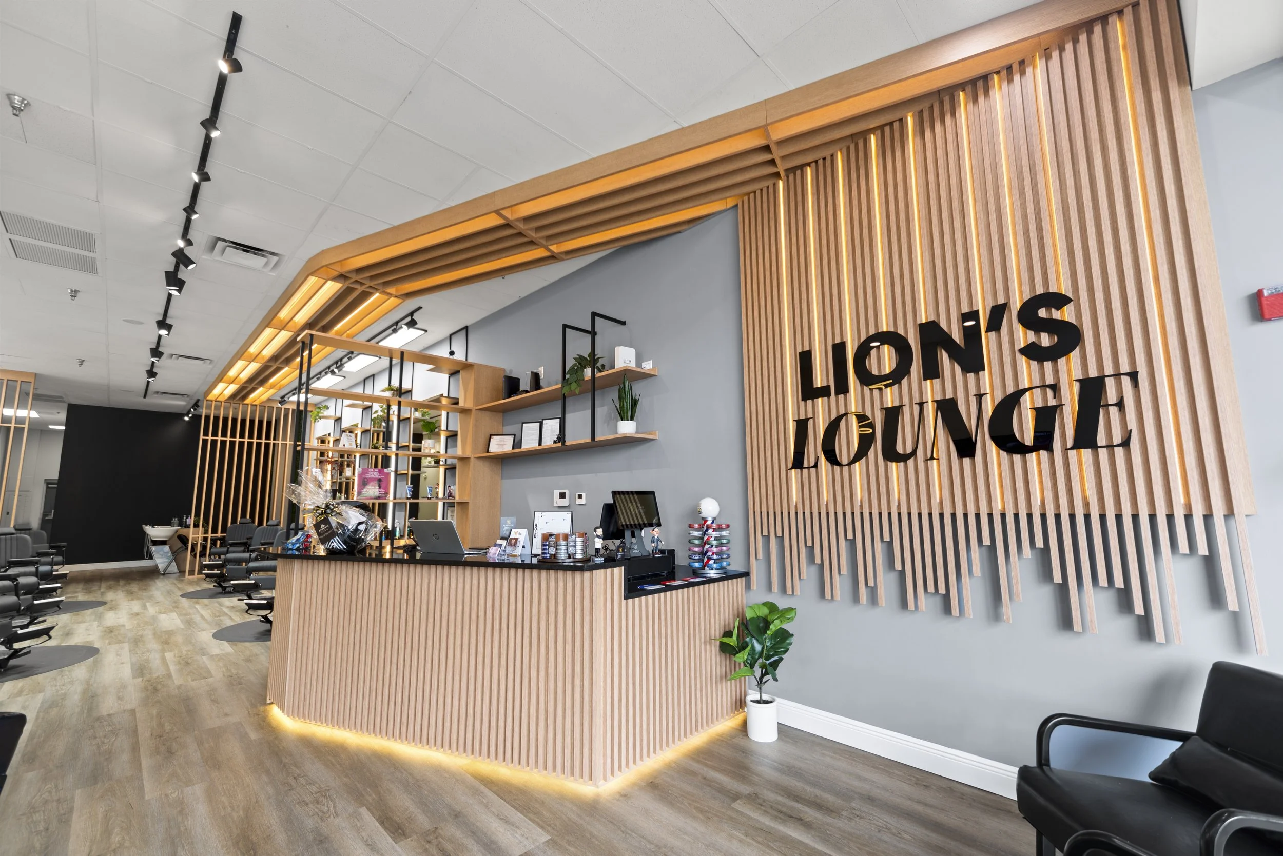 Modern salon reception area with wooden decor, a curved front desk, black chairs, and a large sign reading 'LION'S LOUNGE' on the wall.