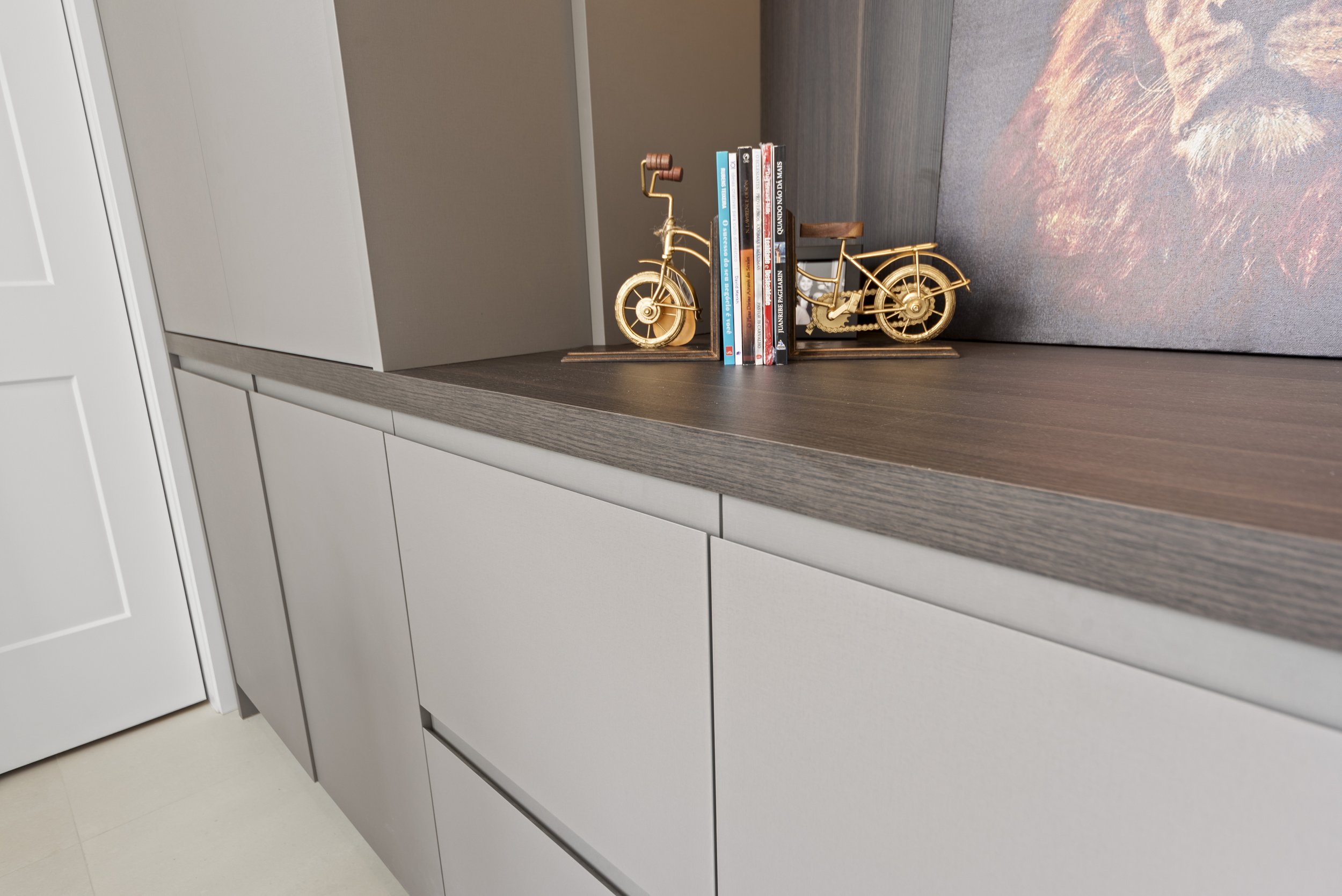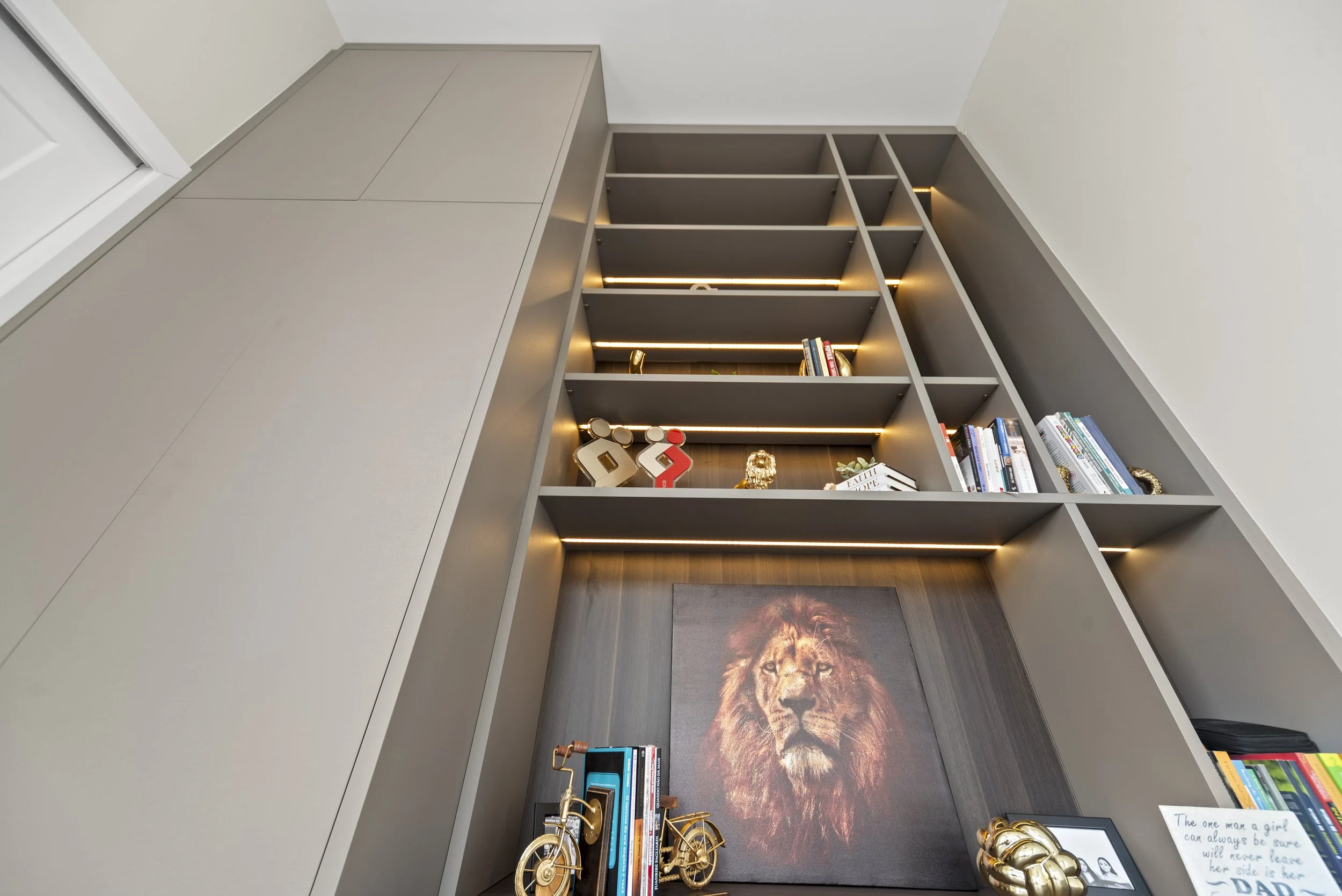 View of a modern, gray wall-mounted bookshelf with LED lighting, decorated with books, awards, and decorative items, including a lion portrait at the bottom and a motivational note.