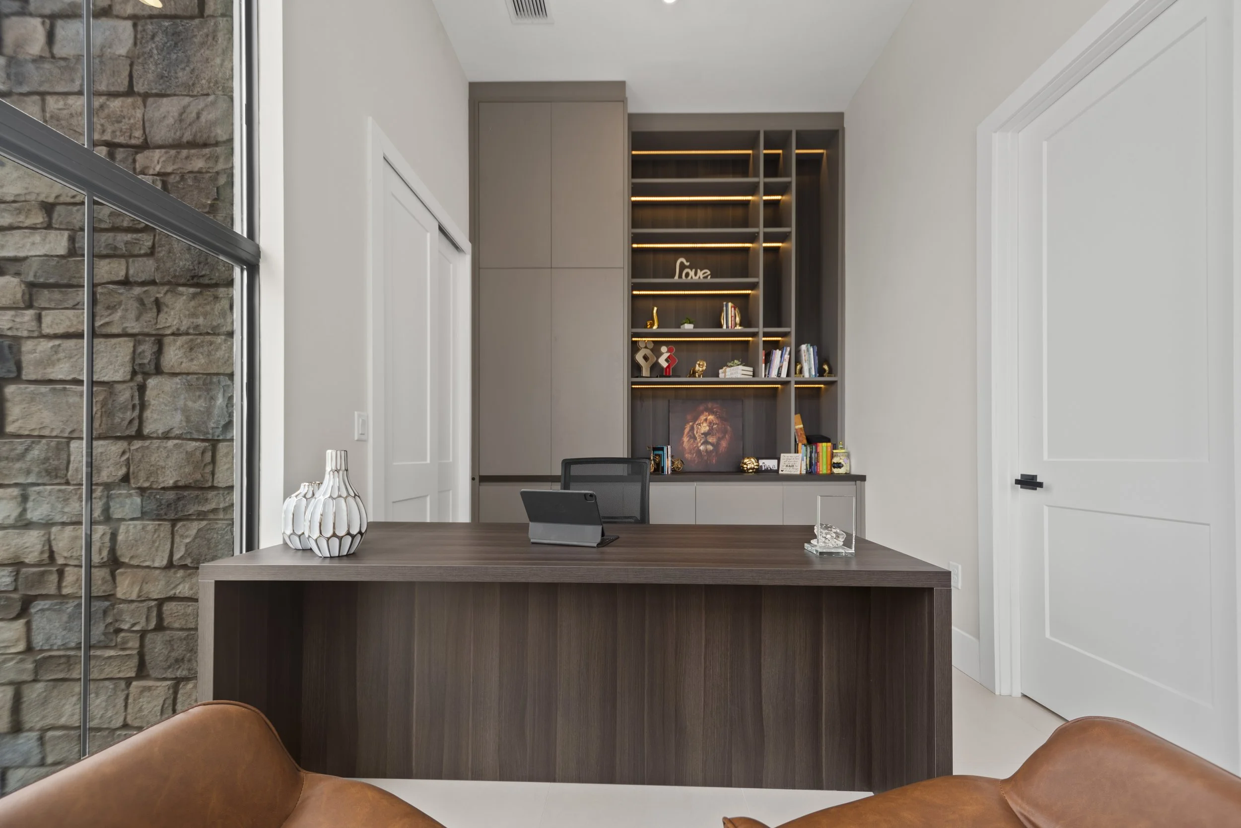 Modern office with a wooden desk, a black chair, and built-in shelving unit with lights, artwork, books, and decorative items.