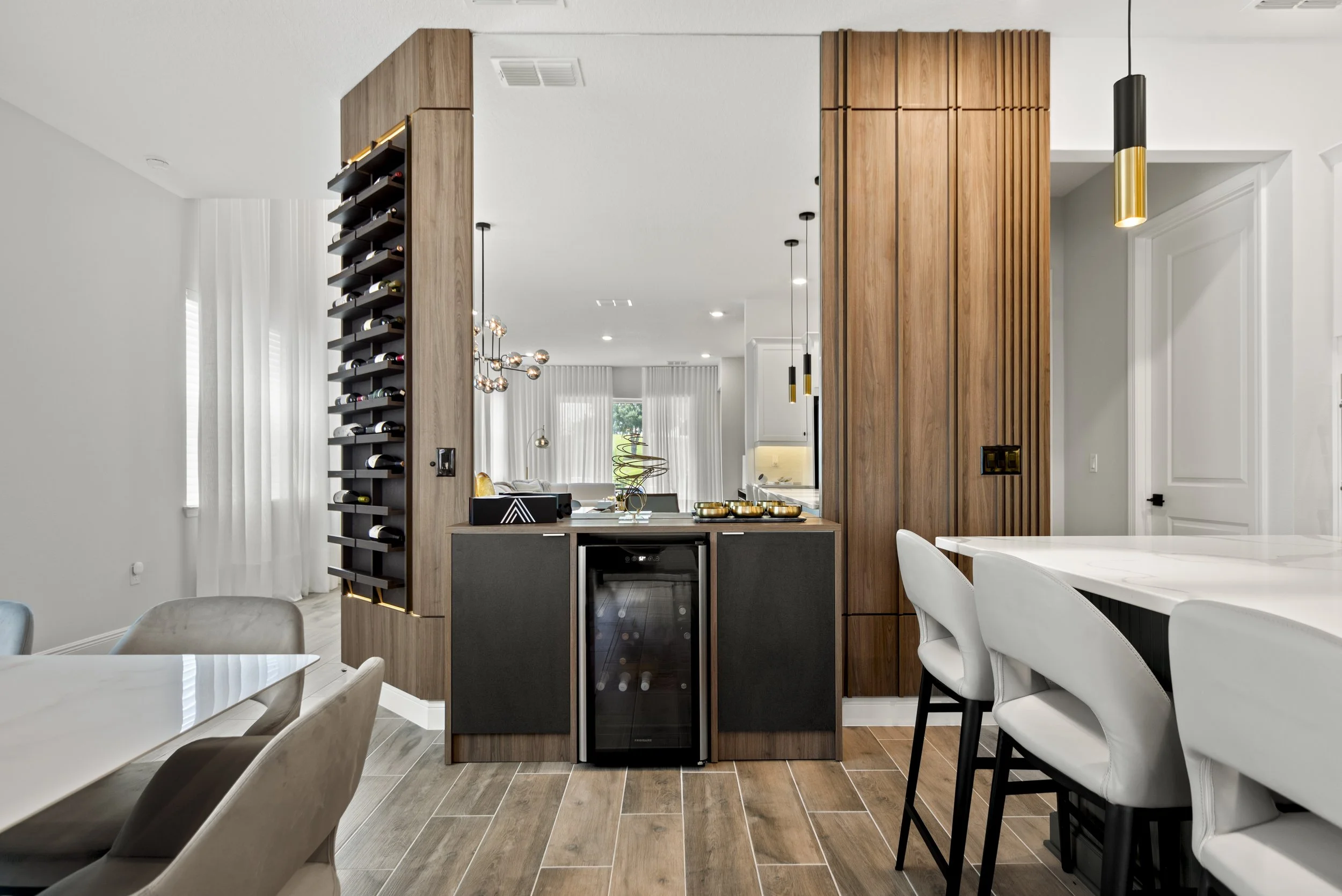 Modern kitchen with a built-in wine fridge, wooden accent walls, and a dining area with white chairs.