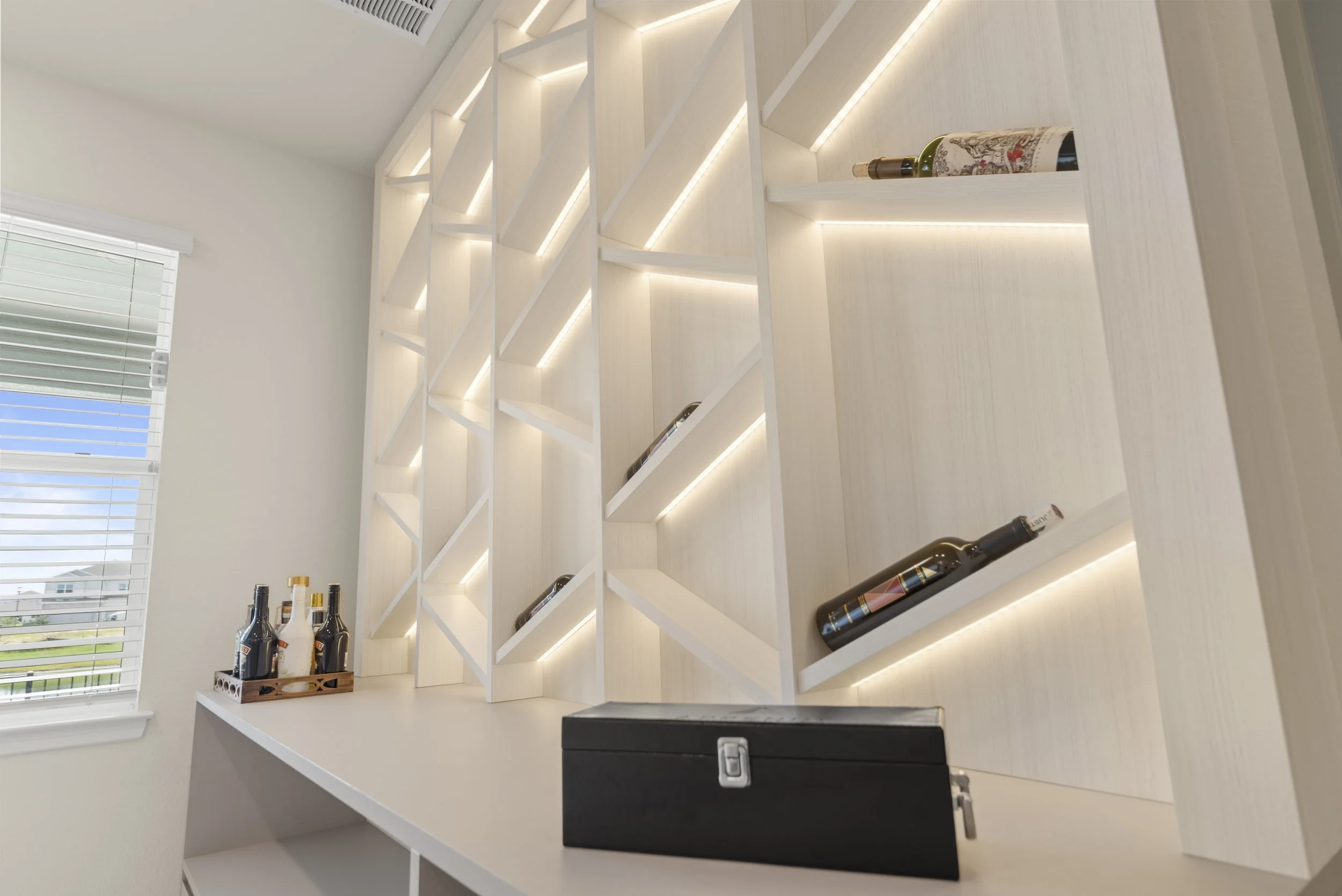 White built-in wine rack with angled shelves and LED lighting, with bottles of wine and a black storage box on a white countertop in a bright room with a window.