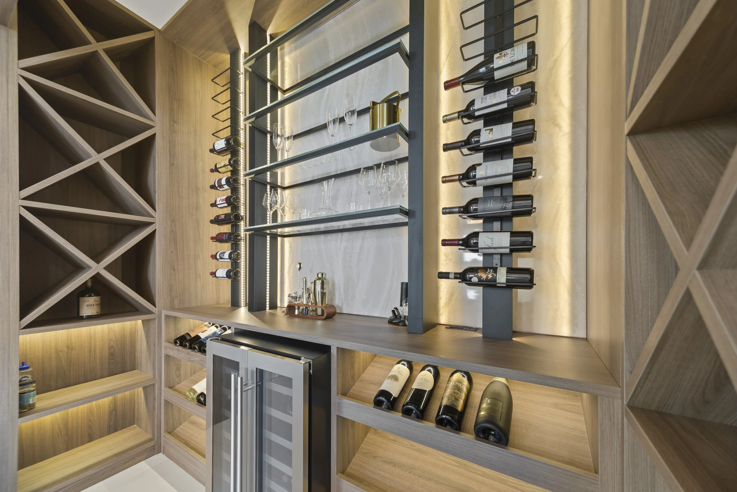 A modern wine and liquor storage area with wooden shelves, wine bottles on a black rack, and glasses displayed on a shelf under warm lighting.