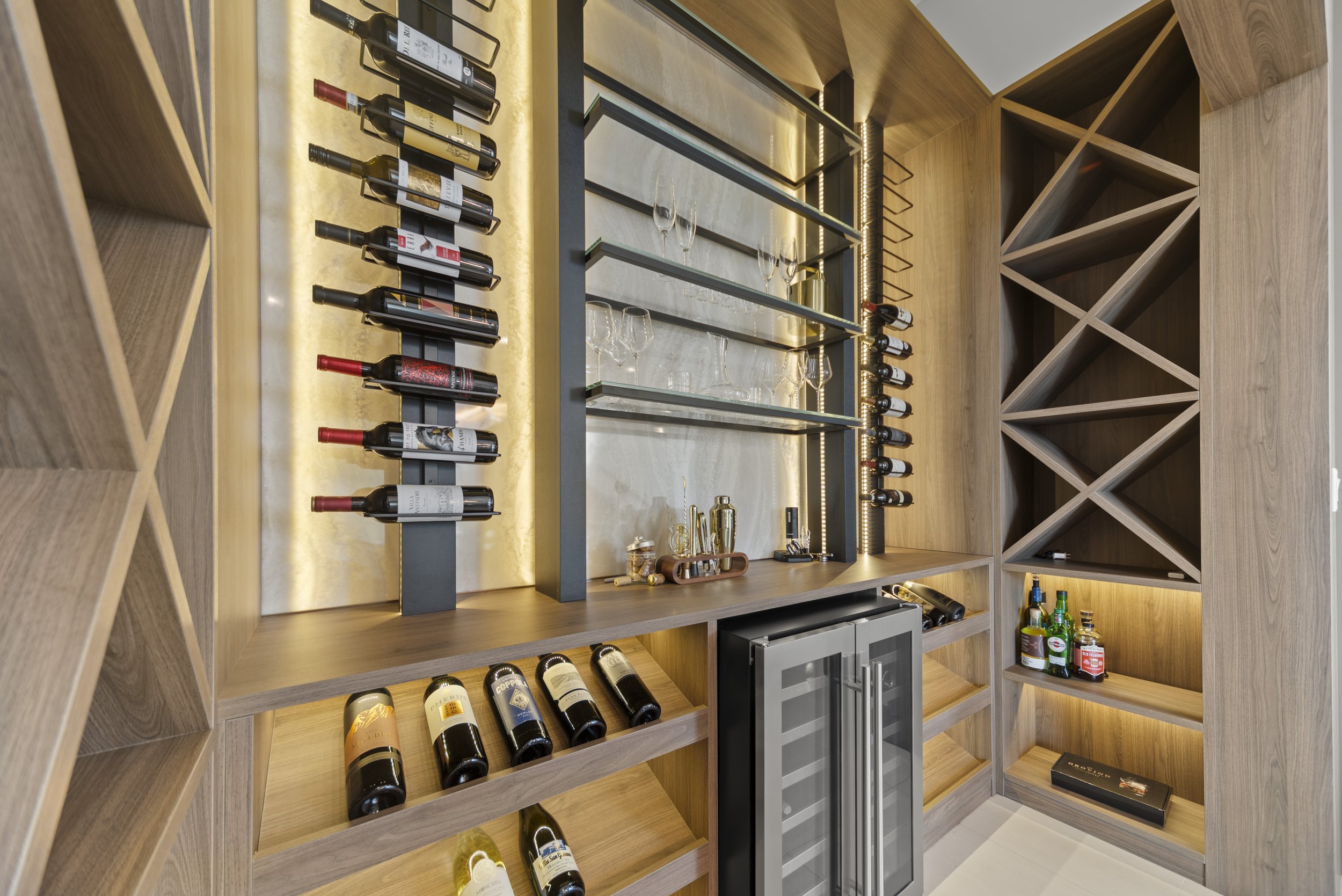 Modern wine bar with built-in illuminated wine rack, bottles displayed on angled shelves, and a small wine fridge underneath on the right side, with a collection of liquor bottles on the left.
